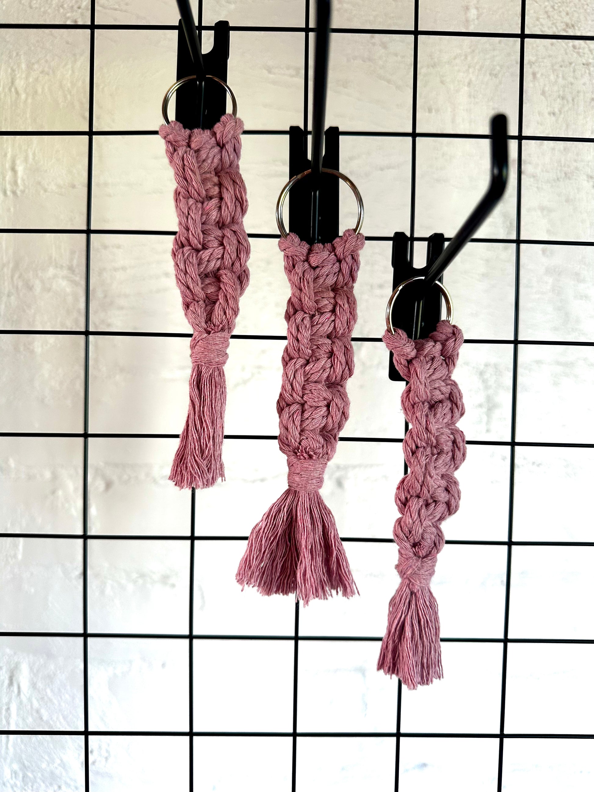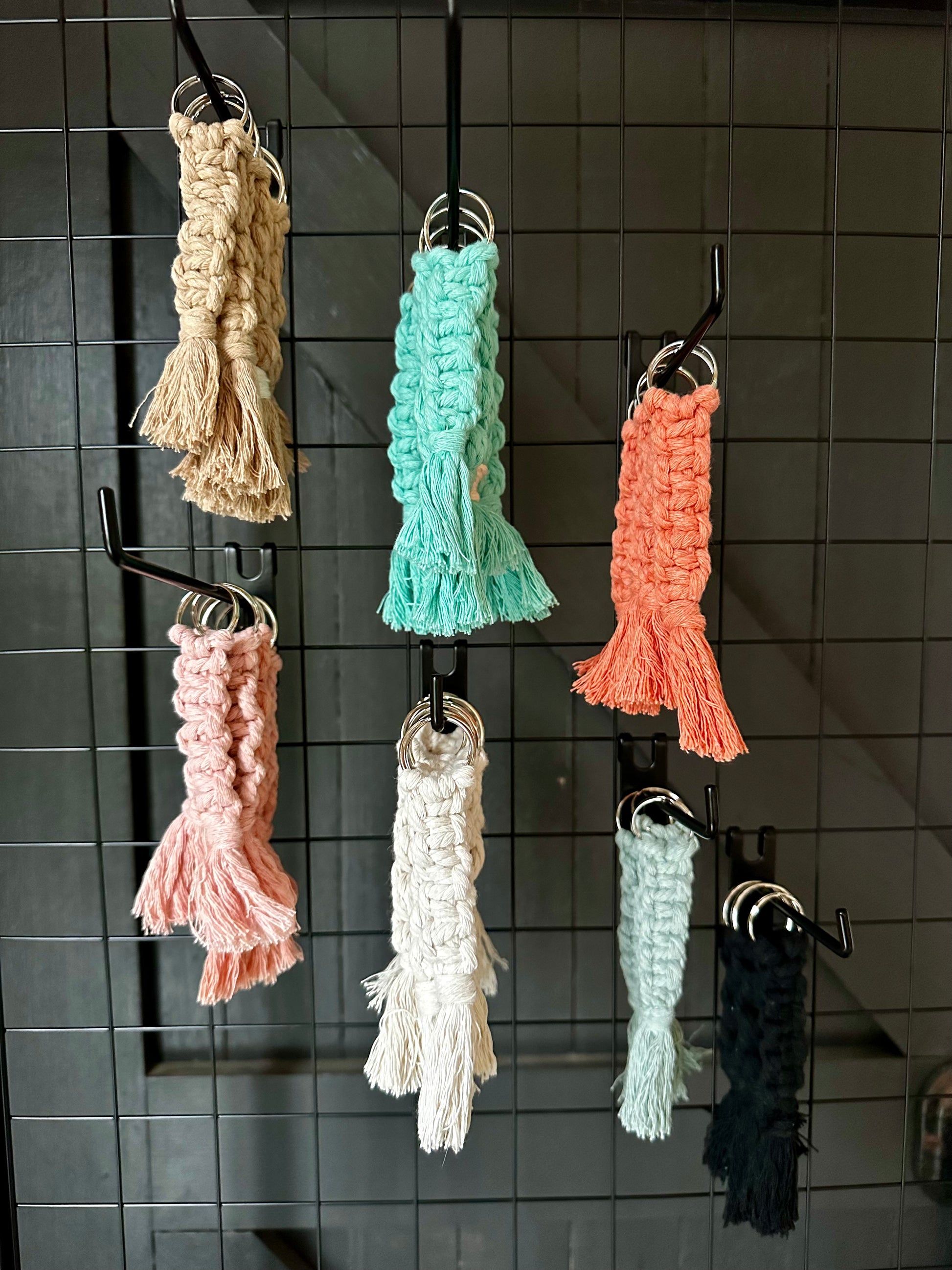Add a touch of handcrafted elegance to your daily routine with these beautifully woven macramé key holders. Designed to keep your keys organized and easily accessible. Perfect for hanging by the door, these keychains not only serve a functional purpose but also bring a boho-chic aesthetic to your space. Available in various colours, these key holders make for thoughtful gifts or stylish accessories to keep your essentials within reach.